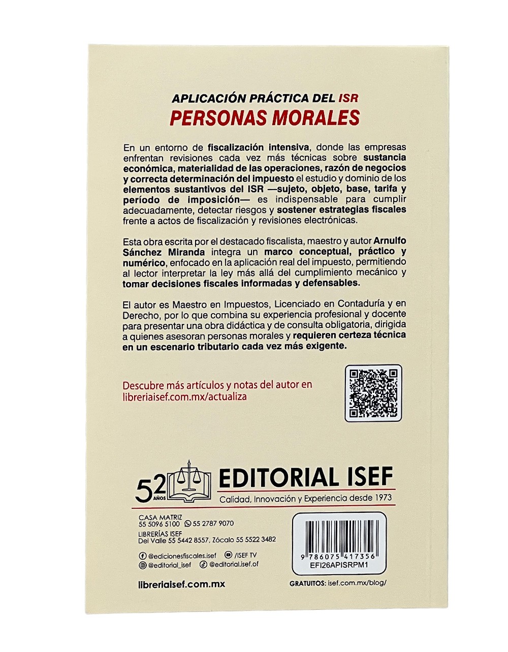 Escrita por el Contador, Abogado y Maestro Arnulfo Sánchez Miranda, esta obra contiene un análisis profundo de los elementos sustantivos del ISR —sujeto, objeto, base, tarifa y período— para fortalecer el cumplimiento y la defensa fiscal.