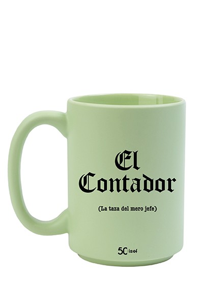 Taza de cerámica en color verde, con acabado mate en el exterior y brillo en el interior, acompañada de la frase “El Contador (La taza del mero jefe)”.