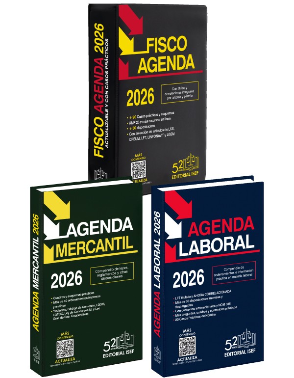 - Fisco Agenda 2026 – Totalmente actualizada, con más de 30 disposiciones, nuevas correlaciones con NIFS, jurisprudencias, LFPIORPI y más, con selección de artículos importantes de LFT, LSS, LGSM y con 90 casos y esquemas prácticos.