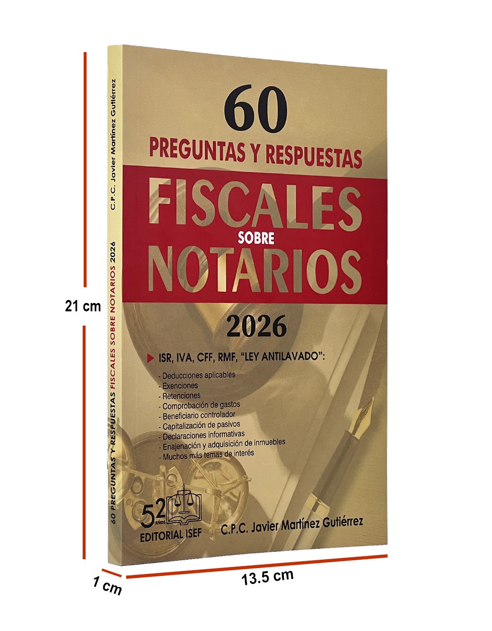 Contiene respuestas prácticas y fundamentadas a las principales inquietudes derivadas tanto de la gestión de la notaría como de las transacciones realizadas por sus clientes; entre ellas: enajenación y adquisición de inmuebles, deducciones aplicables, exención de casa habitación, herencias y legados, retenciones de ISR, límites en operaciones en efectivo, casos en los que la enajenación no causa IVA, influencia del avalúo en las operaciones, comprobación de gastos del notario, beneficiario controlador, capitalización de pasivos, PLD – Prevención de Lavado de Dinero y otros temas de interés para la correcta toma de decisiones.